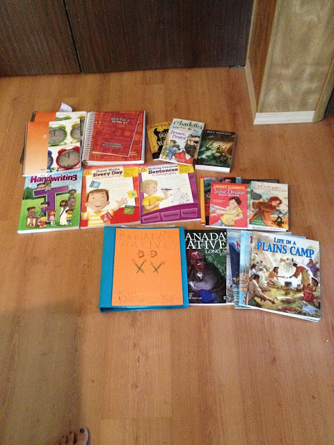 A whole bunch of English, Math, and Social Studies. Aiden's books.